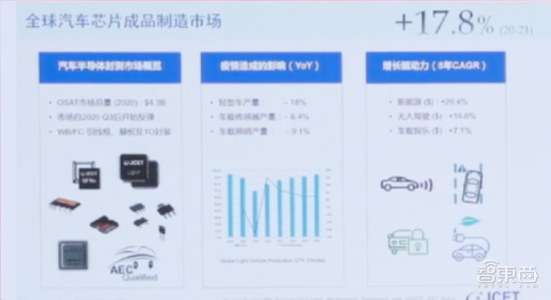 挑战的另一面,全球汽车芯片成品制造亦面临着机遇。随着车载芯片功能日益复杂化,传统车企逐渐抛弃全流程自主生产的 IDM 模式,而是将芯片设计、制造、封测环节委托给更专业的芯片玩家。据郑力分享,2021 年全球汽车芯片成品制造有望同比增长 17.8%,车载芯片制造供应链正开启重组模式,有望引发全新机遇。