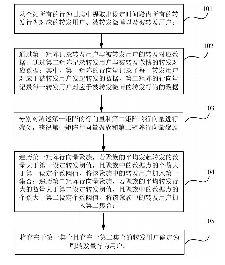 根据专利信息显示,识别转发量的专利可以结合目标用户与被转发用户的信息,联合比较,使用矩阵运算进行聚类,以此判断刷量转发的营销账号。