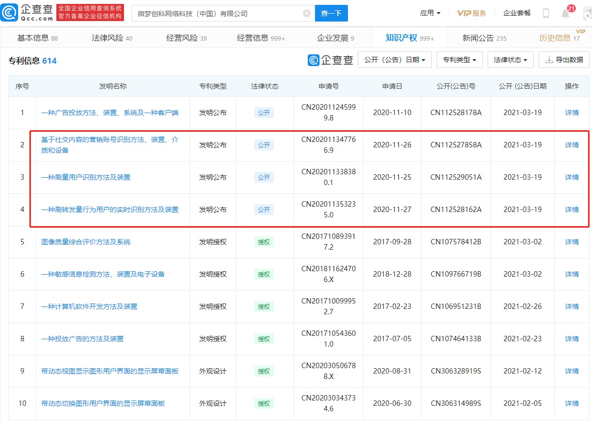 3月22日消息 企查查 App 显示,3 月 19 日,微梦创科网络科技(中国)有限公司公开多项 “刷量用户识别”相关专利,名称及公开号分别为 “一种刷转发量行为用户的实时识别方法及装置”,公开号 CN112528162A;“基于社交内容的营销账号识别方法、装置、介质和设备”,公开号 CN112527858A;“一种刷量用户识别方法及装置”,公开号 CN112529051A。企查查股权穿透显示,该公司由微博网络(香港)有限公司全资持股。
