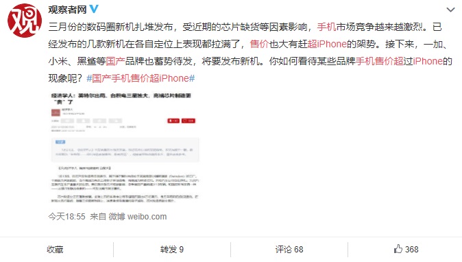 因此,随着网友的互动越来越多,部分国产手机售价超 iPhone 一事迅速被顶上热搜。