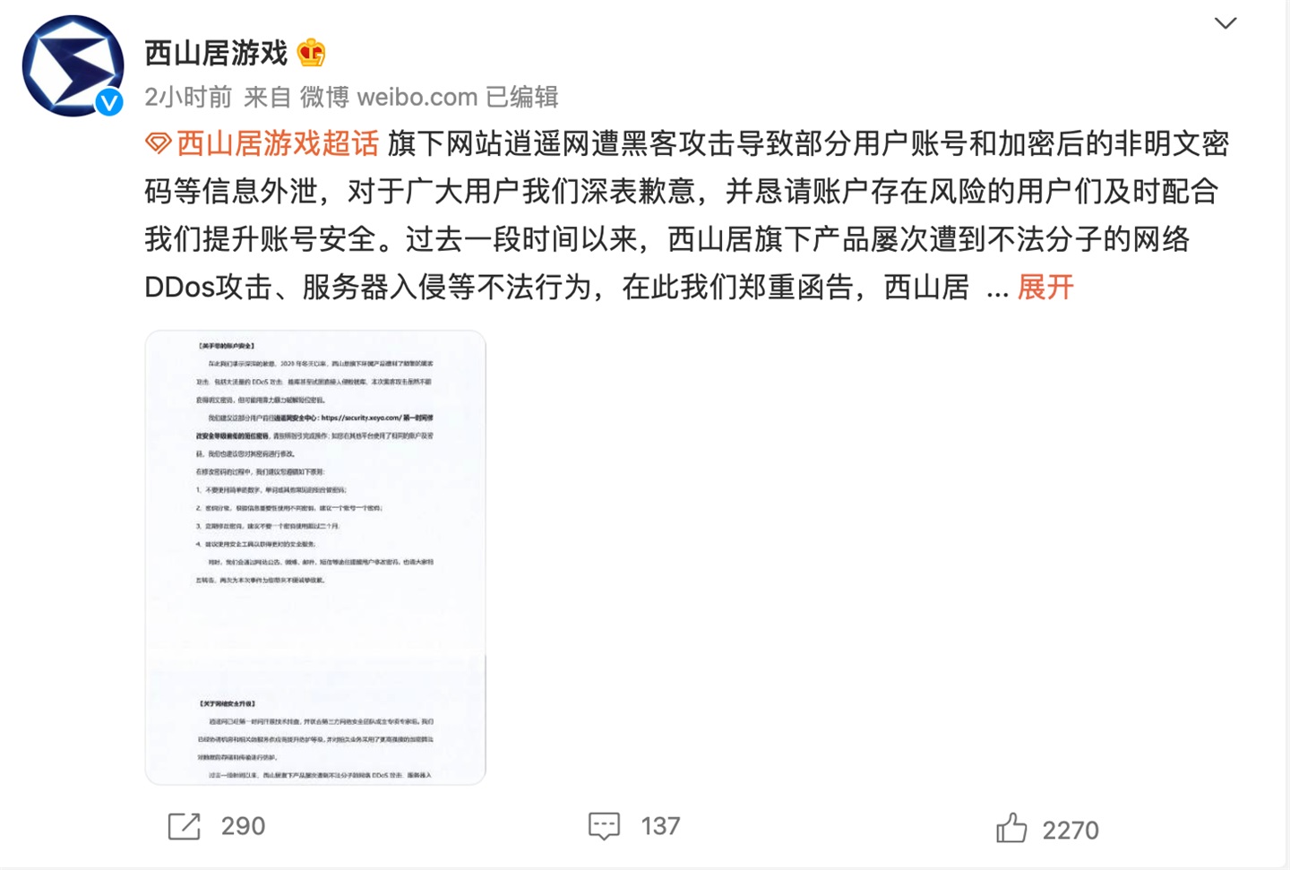 官方表示,2020年冬天以来,西山居旗下所属产品遭到了频繁的黑客攻击,包括大流量的DDoS攻击、撞库甚至试图直接入侵数据库。本次黑客攻击虽然不能获得明文密码,但可能用算力暴力破解短位密码。官方建议这部分用户一时间修改安全等级偏低的短位密码,请按照指引完成操作;如在其他平台使用了相同的账户及密码,也建议您对其密码进行修改。