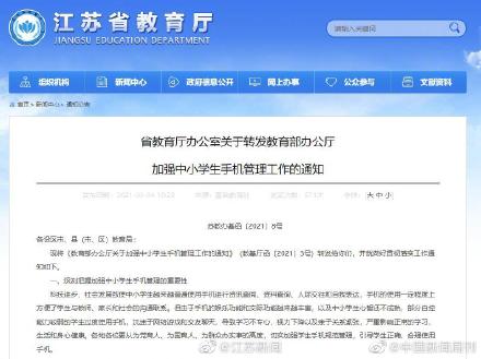 日前,江苏省教育厅下发《省教育厅办公室关于转发教育部办公厅加强中小学生手机管理工作的通知》。其中要求科学制定中小学生手机管理的实施方案,做到“六个明确”,包括明确教师不得用手机布置作业或要求学生利用手机完成作业;明确家长对孩子使用手机监督管理的教育职责等。(江苏省教育厅)