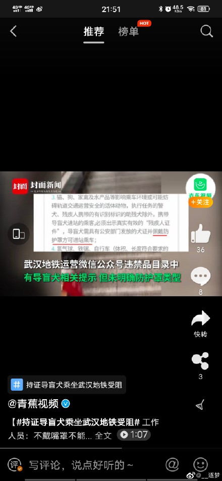 地铁:有相关规定,暂未修改】湖北武汉的王先生反映,3日在乘坐武汉地铁4号线时,因导盲犬未佩戴嘴罩被拒绝乘车。王先生表示导盲犬依靠嗅觉辨路,佩戴嘴罩会影响散热,且无明文规定需要佩戴嘴罩。最终王先生报警处理,在警察的陪同下到达目的地。4日,武汉地铁工作人员表示,该规定由市公安局交通运输局2017年制定,目前依旧按此规定实施。