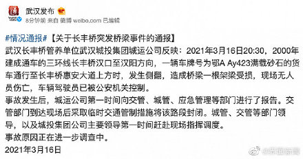 【突发!网友爆料:运载沙石的货车致武汉三环线的长丰桥桥面塌陷】据网友爆料,今天晚上9点多钟,一辆装载沙石的货车,行驶在武汉三环线长丰桥桥面时,发生侧翻,导致一处桥面出现塌陷,现场交通中断,相关部门正在现场进行处置。