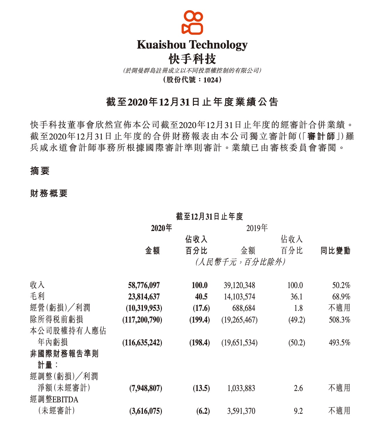 23 日消息 今天,快手发布 2020 年第四季度及全年财报。快手 2020 年全年营收 587.8 亿元,市场预期 593.82 亿元。2020 年全年股权持有人应占年内亏损1166亿元,调整后净亏损 79.5 亿元。