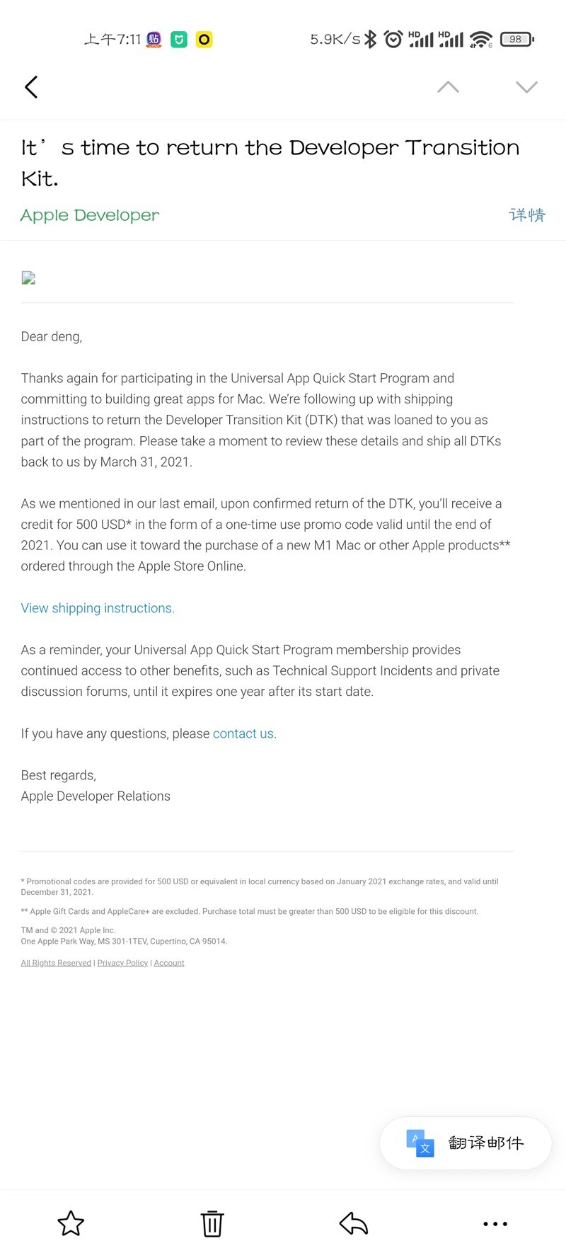 正如我们在上一封电子邮件中提到的,在确认归还 DTK 后,您将收到 500 美元的信用额度,该信用额度将以一次性使用的促销代码形式提供,有效期至 2021 年底。你可以用它来购买新的 M1 Mac 或其它可通过 Apple Store 在线订购的 Apple 产品。
